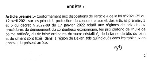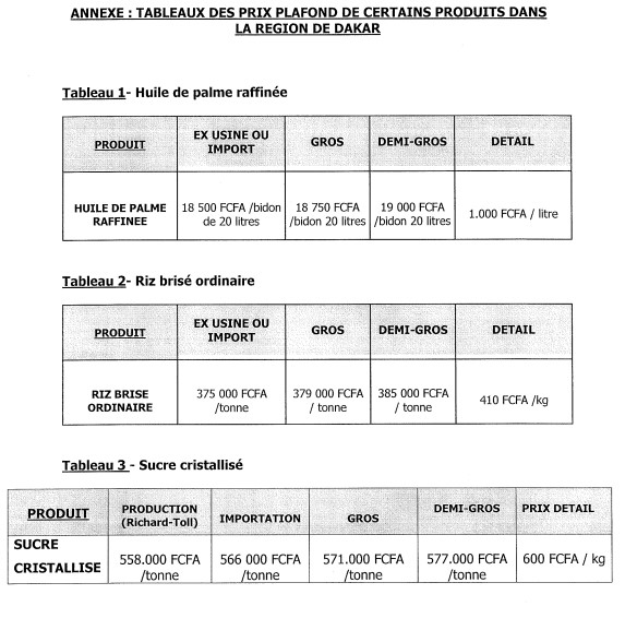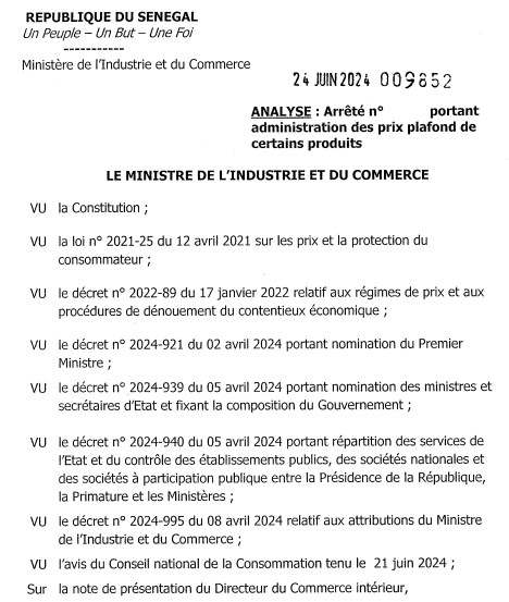 Après l’entrée en vigueur ce lundi 24 juin à 00 heure, le ministère de l’industrie et du commerce vient de publier l’arrêté des nouveaux prix plafond de certains produits : l’huile, le riz, le sucre la farine, le pain et le ciment.
